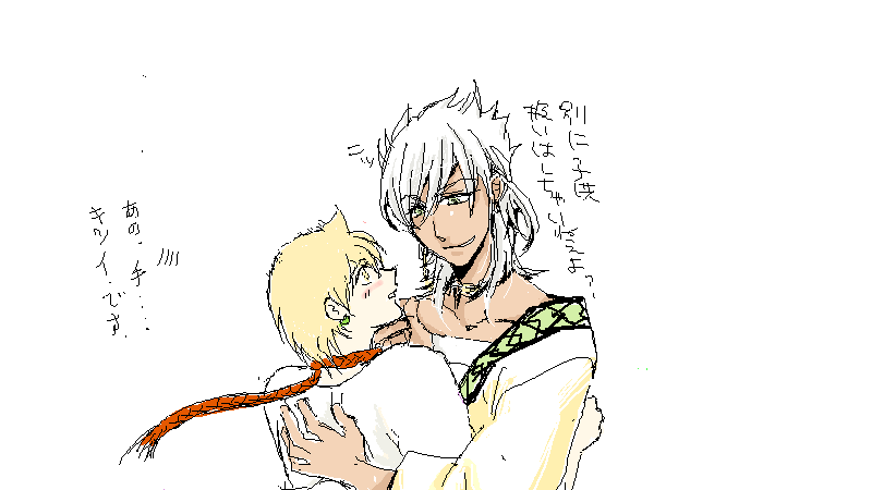アリババくんは最初、普通にキスを待ってドキドキしてる顔にしたかったんですが…色々いじってるうちに何故か小悪魔っぽい顔に!