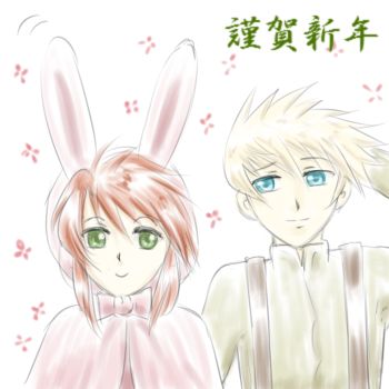 ウサギ年と言う事で、うさ耳な子ルクと子ルクの可愛さに何故か困ってる(笑)少年ガイで年の初めのご挨拶をばv