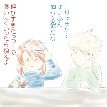 焼いてる時はともかく、ぜんざいに入っているお餅がこんなふうに↑伸びる事は無いかもですが、お餅と戯れるルークが描きたかったのです笑v