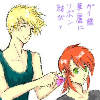 ガイはルクの後ろ髪がちょっと暑そうだなーと思って髪を結んであげてるところです…が、ちょっとした悪戯心でピンクのリボンで結んであげてます^^