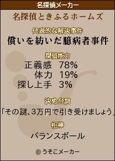 世間ではホームズ映画が話題?らしく、それにちなんだメーカーあったのでしてみました♪お馴染(笑)うそこさんの名探偵メーカーでっすv