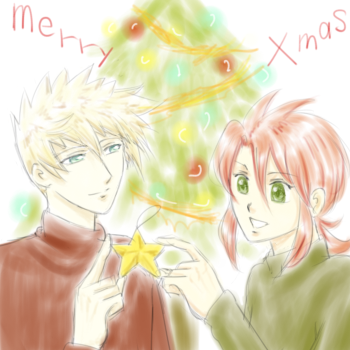 ↑は、これから飾りの仕上げに天辺のお星さまを二人で付けようとしてるところのつもりです。