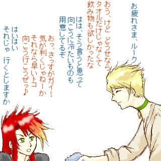 某mーさんに「フレユリが見たい」とおねだりしたら、タオル差し出してお疲れさまなフレンと暑がってるユーリという、素敵なフレユリを頂きましたvvヽ(^o^)丿