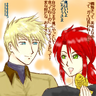 美味しそうに食べているルークを見ているだけで、幸せでお腹いっぱいになっちゃってるガイと、ガイの分まで貰って悪いと思いつつも、美味しさに食べるのが止まらないルーク…のつもりで描いてみましたvv