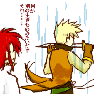 ガイは普通の剣士なので詠唱はしませんが、もしもクラパパやゼロスやカノンノみたいに魔法剣士だったら…ベストのあのしっぽ(?)がバタバタはためいていたかも知れないなーと思いまして。