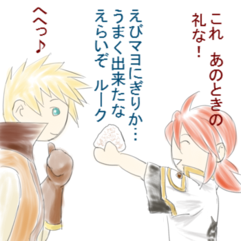 ↑は、幼い頃にガイに作ってもらったオムライスの事を憶えていたルークが、得意のえびマヨにぎりでお返しをしているところに見てやって下さい。