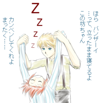 子ルークにバンザイさせて、パジャマを引っ張って脱がせ…ようとして手こずってる14歳ガイ^^