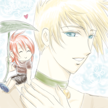 少し前に描いた、最初の葉っぱ傘ルークをご覧になったSちゃが「ガイの肩に乗る妖精さんみたいなルーク」という、とても素敵な発想をして下さったので、それに便乗させて頂きましたvv\(~o~)/