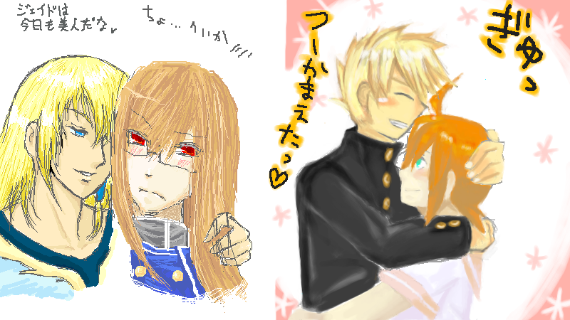 左のピオジェは私(ピオニー)と紅羽さま(ジェイド)の合作、右のガイルク(子?)は、こつぶさま(ガイ)とはつきさま(ルク)の合作ですv
