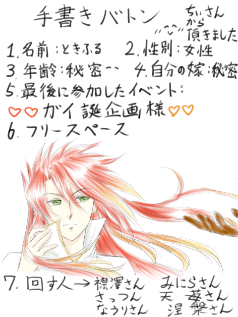 ちょっと久々のバトンでございます。ちぃさんから頂きましたーvv