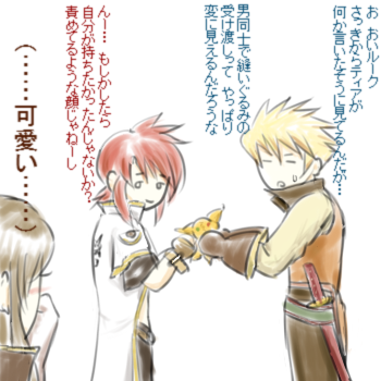ダアト内で、受け止めたトクナガをずっと持ってるガイが何だか可愛いと思ってしまいました…話の流れは、どシリアス真っ最中だと言うのに!><